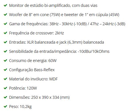 Monitor de estúdio nearfield (de proximidade) de 2 vias com bass-reflex, bi-amplificado com altifalante de 8” e tweeter em abóboda de 1”.
