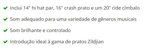 Inclui 14" hi hat par, 16" crash prato e um 20" ride címbalo